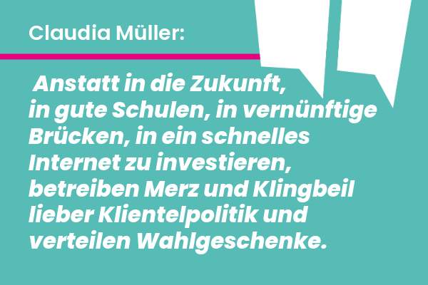 Union und SPD sind dabei diese 500-Milliarden-Chance für unser Land zu verzocken. Anstatt in die Zukunft, in gute Schulen, in vernünftige Brücken, in ein schnelles Internet zu investieren, betreiben Merz und Klingbeil lieber Klientelpolitik und verteilen Wahlgeschenke. Die Studien vom Institut der deutschen Wirtschaft Köln (IW) und vom Münchner ifo-Institut bestätigen unseren Vorwurf.
